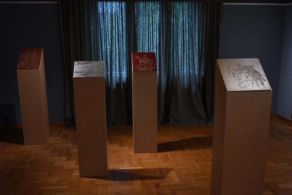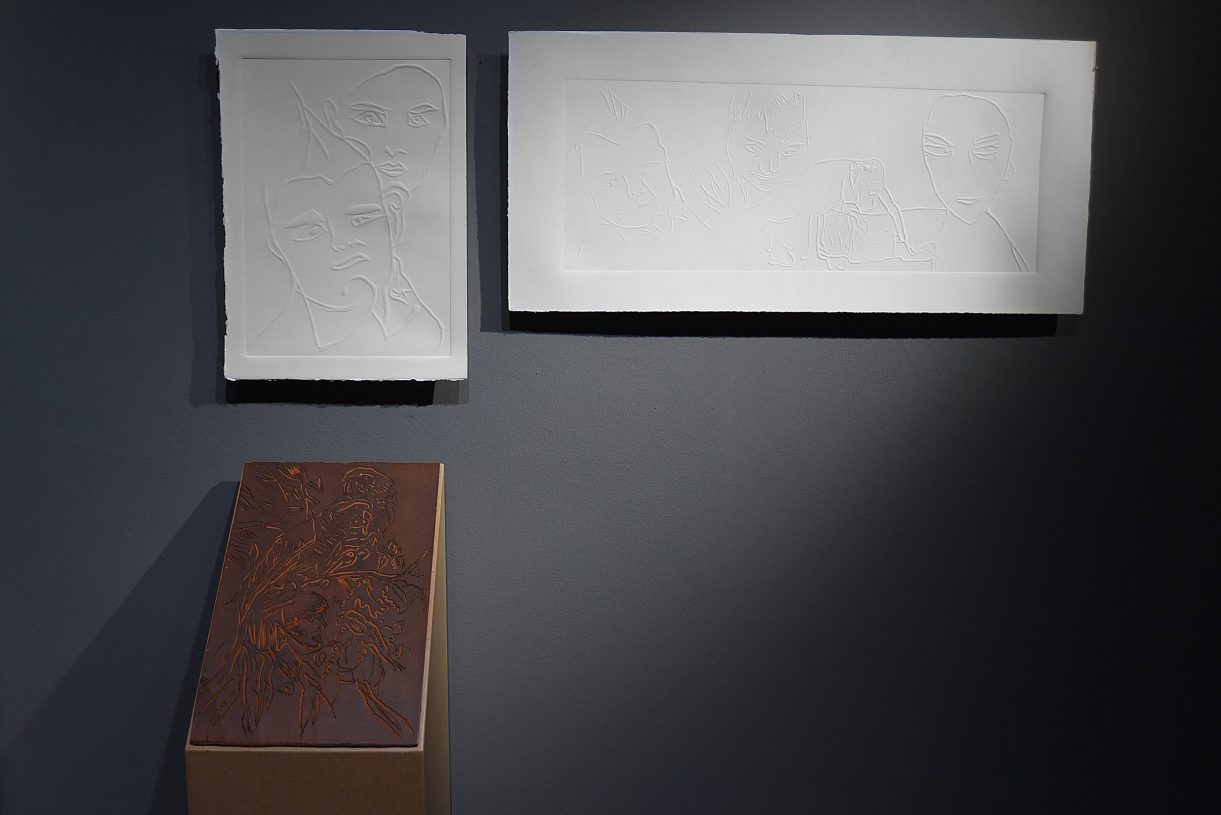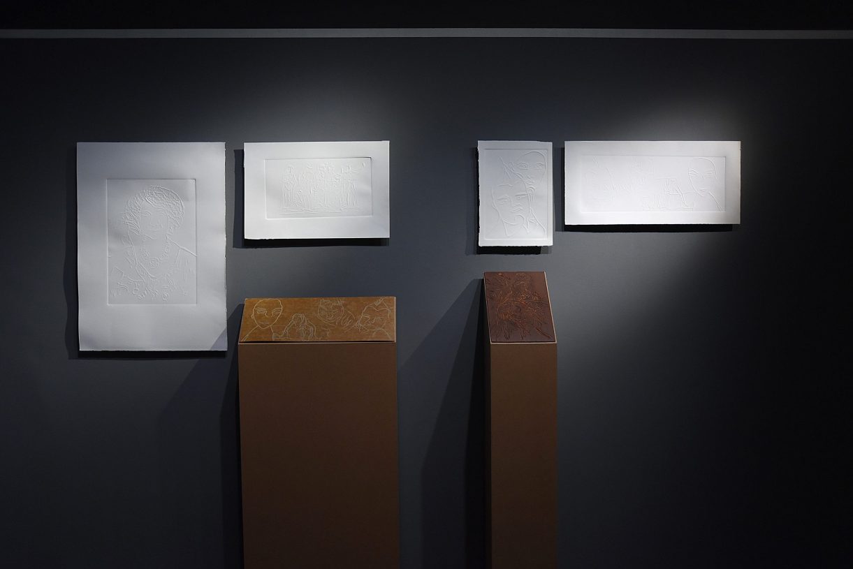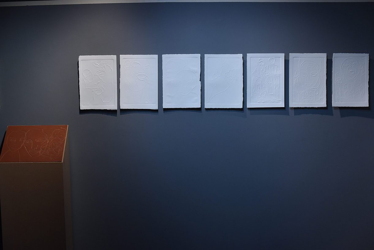 Silence and the unseen are the main subjects in this body of works. People and their voices, their transformations into birds driven by the necessity of a salvation, the muteness that intercedes in between, a cultural, gendered or personal trauma, the speechlessness of the unspeakable, are all to be found engraved on surfaces, sometimes with deep cuts and sometimes ex-pressed on white papers as traces that foreshadow healing. The subject matter emanates from incidents where the cry is repressed until the time of metamorphosis, and from forms that struggle to speak in the hope of an indirect gaze. The exhibition consists of twelve carved linoleum matrices in different colors positioned on wooden lecterns and a large series of dry embossed white Fabriano papers. Although relief embossing is a traditional technique of printmaking, in this case the typography elements are replaced by lines and forms that are texts themselves and they appear as transfigured phrases or even titles of old songs from Smyrna into birds, children and flowers. The choice of printmaking as a medium to tell these stories suited well to the need of finding out how experiences, losses, pain and language itself can be inscribed after they have been dissociated from the “maternal moment” and have permitted time to do its work. And while neither birds nor songs change character, what is left to discover is the timeless component of oblivion and silence. What kind of voice expresses better, in secrecy and suggestively this Never?