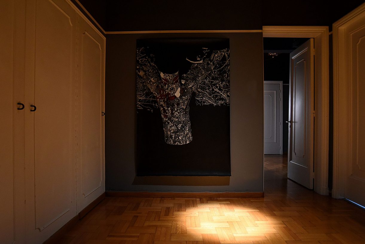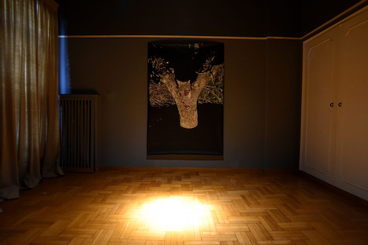 The three paintings that complement the exhibition are offsprings of “The Collared Dove”, a work that I presented in various versions in the past, most recently in the summer of 2017 as part of the exhibition “The garden sees” curated by Anna Kafetsi. It consisted of video projections on the trunk of a tree, depicting scenes from fairy tales along with the call of the bird that never stops to ask for justice while it remembers that once upon a time it used to be a human being.