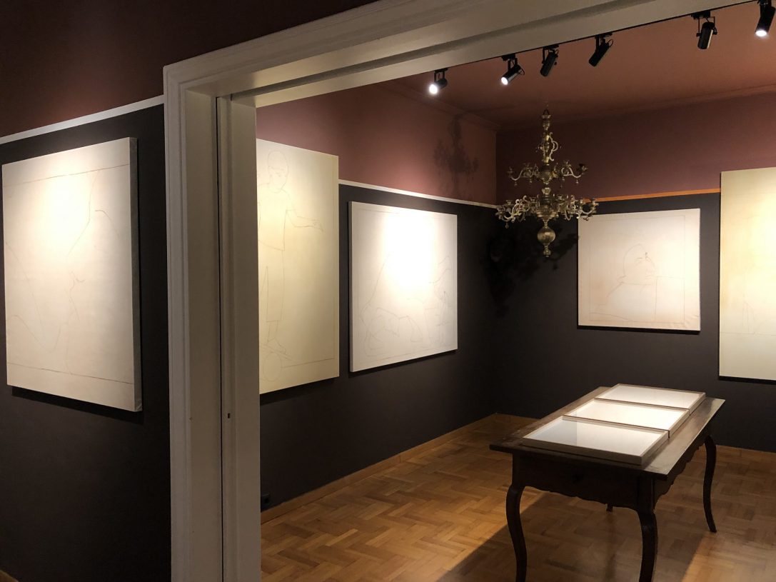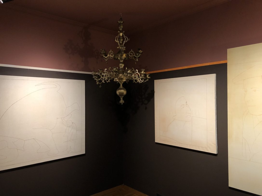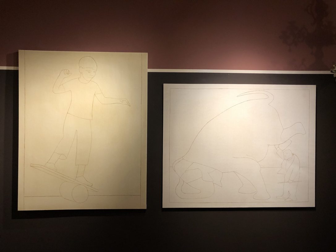 Papailiakis spreads his matter (as he prefers to call his colored oil paints) on the canvas as evenly as possible. He uses minimal paint which allows for the canvas’ textures to be visible and thus part of the work, noticeable with a closer look. After this treatment he begins to render the subject matter by drawing selected lines with a thin paint brush. He doesn’t use outlines or guides; instead, he paints decisively and directly on his surfaces, without corrections. A confident, automated approach towards drawing, undermining the traditional layering in painting.