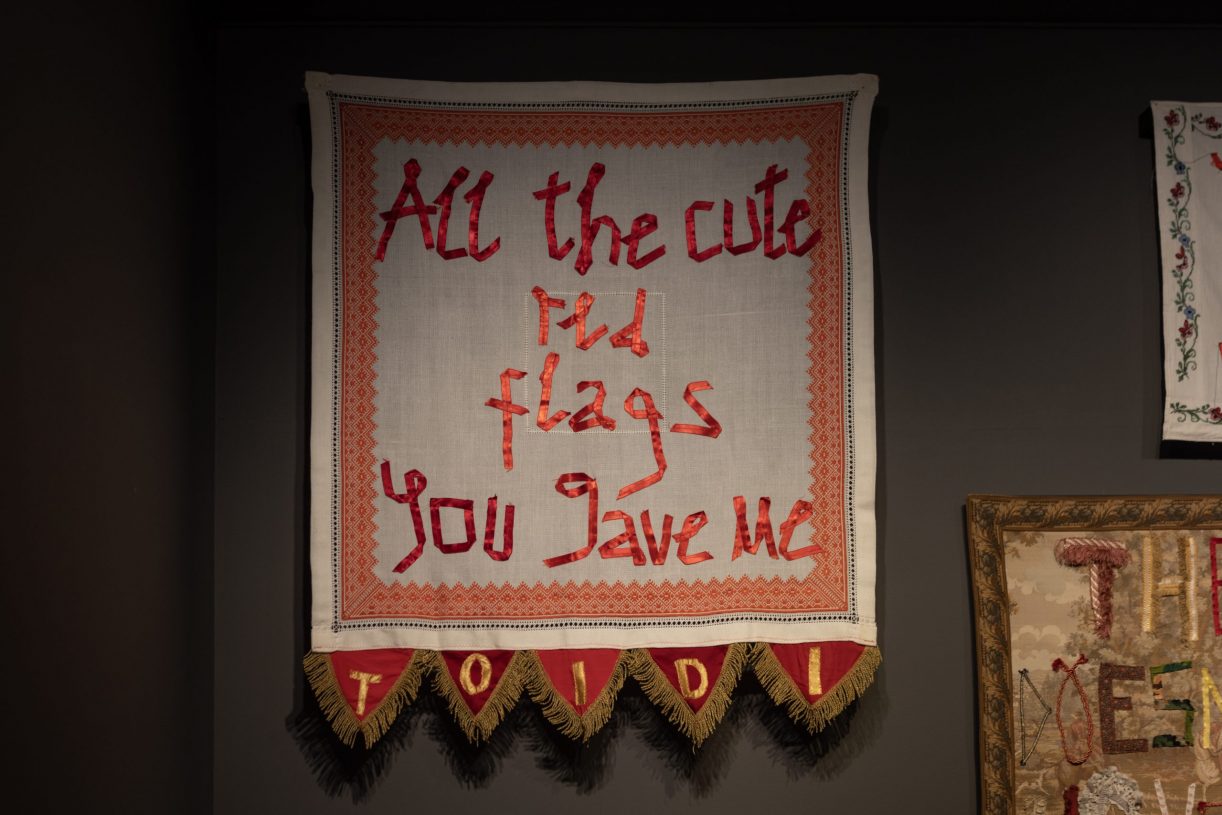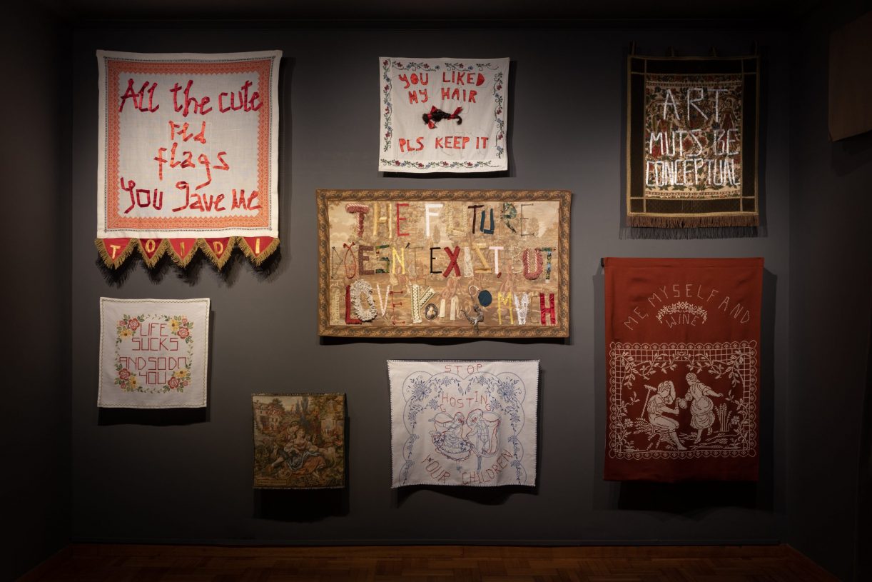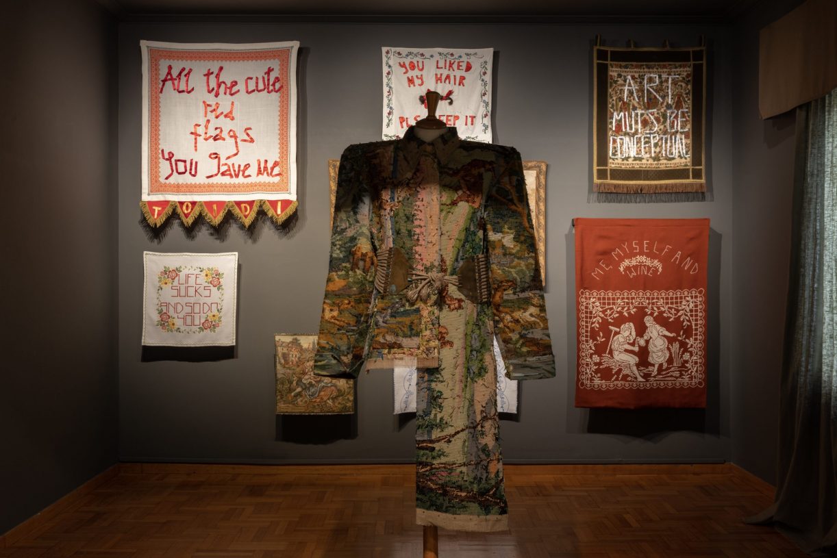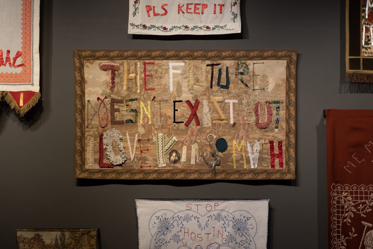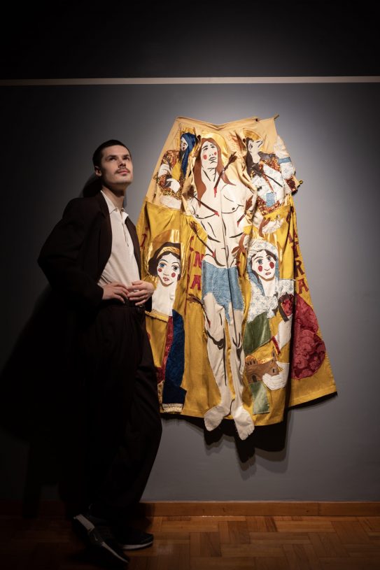 His first solo show in Greece “The future isn’t real but I love you so much” brings together two different bodies of work. The first includes works with found fabric, embroidery and costume design that refer to his cultural heritage, personal experiences and social urgencies. On the one hand he constructs flags that manifest the contemporary needs of the youth, embedded on traditional domestic objects, highlighting the juxtaposition of his Ukrainian heritage and his contemporary experience, while on the other he designs utility clothing and uniforms with ecclesiastical or folklore fabrics.